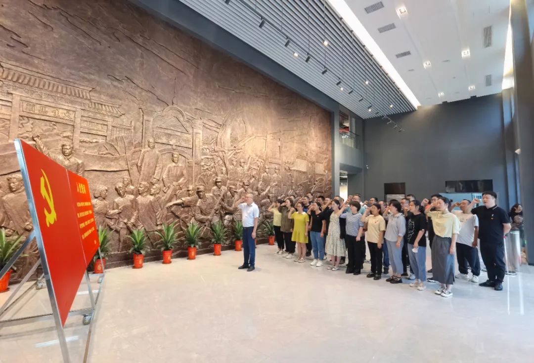 伴随着初秋的微风细雨,大家来到通州区烈士陵园历史革命纪念馆,该馆由集团下属神辉公司代建,于今年年初竣工交付。步入馆内序厅首先映入眼帘的是一幅巨型浮雕壁画,展现了钟楼、大生纱厂、师范学校等记载南通近代第一城的标志性建筑,也刻有中共江北特委和南通县抗日民主政府纪念碑,描绘了南通抗日军民筑起一道攻不破的钢铁长城的场景。站在巨型浮雕前,全体党员一起高举右手,面对鲜红的党旗,重温入党誓词,铿锵有力的宣誓声响彻大厅。